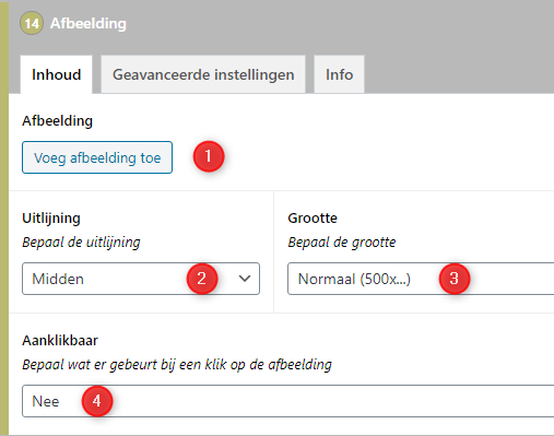 1. Voeg afbeelding toe. Kies hiervoor een afbeelding uit de mediabibliotheek of upload een bestand van uw pc.