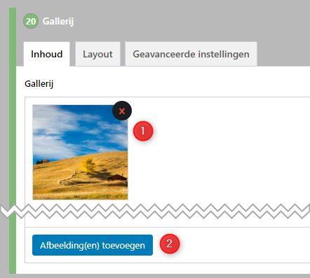 - Indien uw galerij al afbeeldingen bevat, ziet u deze hier staan. Staan er meerdere dan kunt u deze oppakken met de muis om in de juiste volgorde te zetten. Een reeds geplaatste afbeelding kunt u verwijderen met het kruisje.