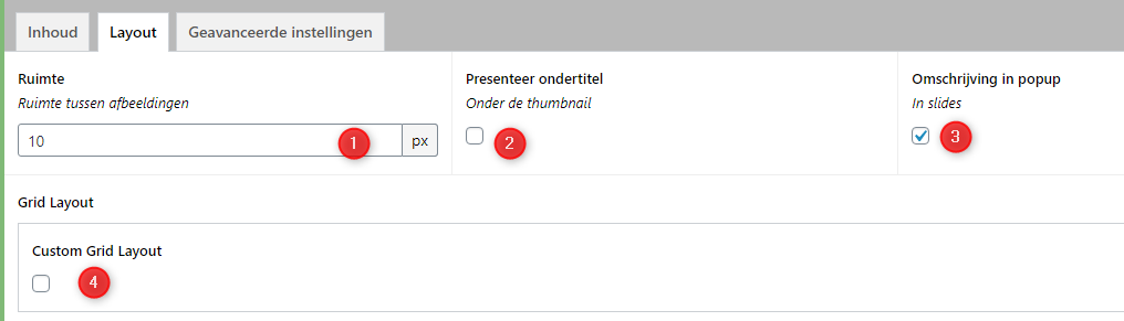 - Geef aan of u gebruik wilt maken van een custom grid layout. Hiermee kunt u bepalen hoeveel afbeeldingen naast elkaar worden getoond op een bepaald formaat scherm.