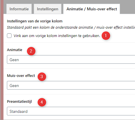 U kunt nog wat aangepaste instellingen maken, zoals hoe een kolom zich moet gedragen wanneer men er met de muis overheen gaat of dat de kolom inspringt op de pagina. Dit kunt u instellen in het tabblad Animatie / Muis-over effect.