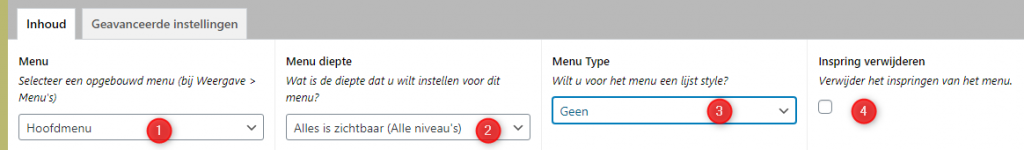 U kunt nog wat aangepaste instellingen maken, zoals hoe een menu zich moet gedragen wanneer men er met de muis overheen gaat of dat het menu inspringt op de pagina. Dit kunt u instellen in het tabblad Geavanceerde instellingen.