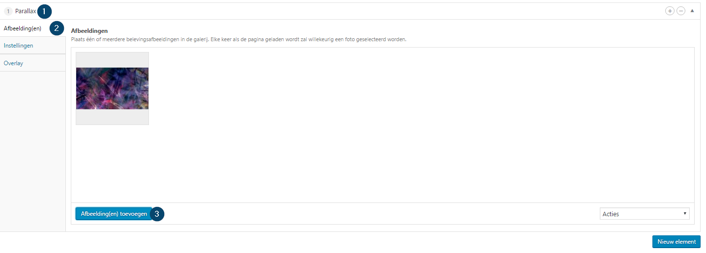 Zodra het element ‘Parallax’ is toegevoegd kunt u deze instellen.
