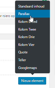 Zodra u op uw pagina bent waar u een Parallax wilt toevoegen drukt u bij Contentvelden op het knopje: Nieuw element.