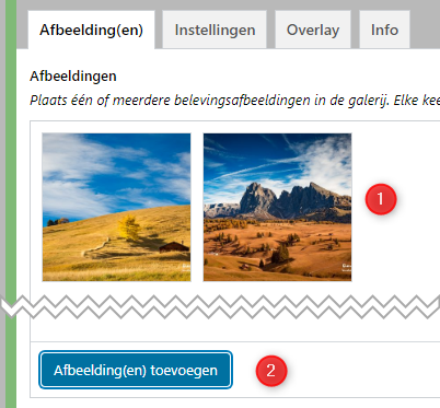 2. Nieuwe afbeeldingen kunt u toevoegen door te klikken op Afbeelding(en) toevoegen. U kunt in de mediabibliotheek er één of meerdere selecteren of nieuwe uploaden vanaf uw computer.